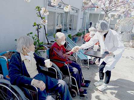 栄養士が用意した甘酒をお配りすると、皆様からは「春らしくて嬉しい」「外の空気が気持ちいい」